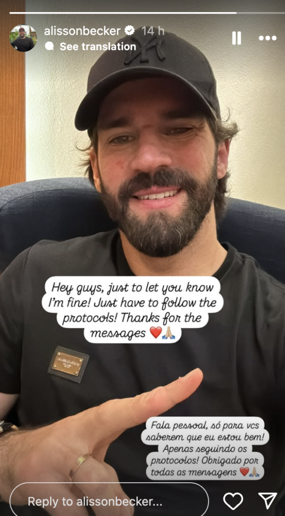 Alisson took to Instagram to share a positive update with supporters, writing: “Hey guys, just to let you know I’m fine! Just have to follow the protocols! Thanks for the messages.”