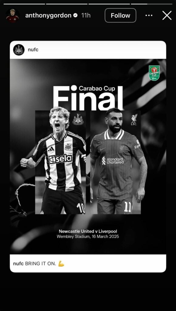 Newcastle winger Anthony Gordon took to social media to send a warning shot to Liverpool ahead of their League Cup final meeting.