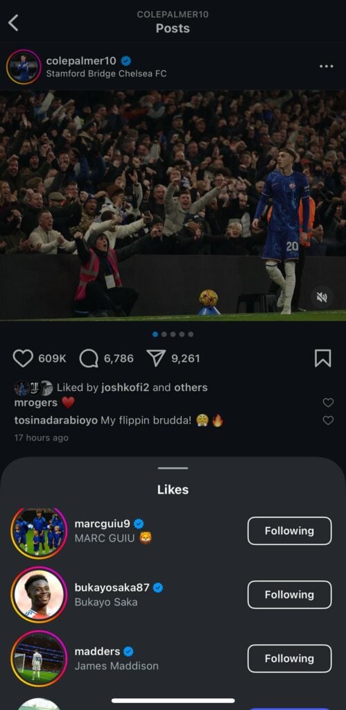 Bukayo Saka and James Maddison react to Cole Palmer post after Chelsea win