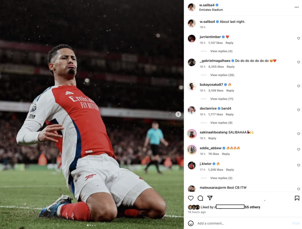 His teammates joined in the fun, with Bukayo Saka commenting with a fire emoji, Gabriel referencing Saliba’s chant, and Jurrien Timber leaving a love heart emoji.