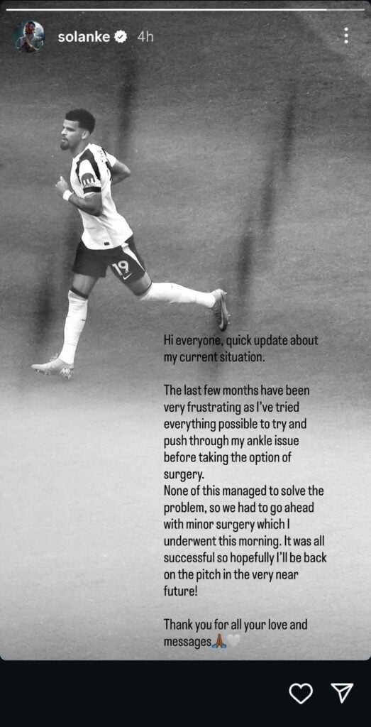 Taking to Instagram to update supporters, Solanke has confirmed that he has undergone a minor surgery to repair a niggling ankle problem that he has been playing through this season.