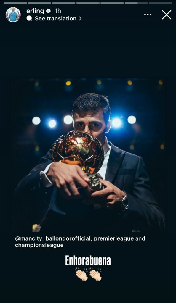 While Real Madrid fans and players alike rage on social media about the decision not to award Vinicius the Ballon d’Or, Haaland has shown his support to Rodri on Instagram.