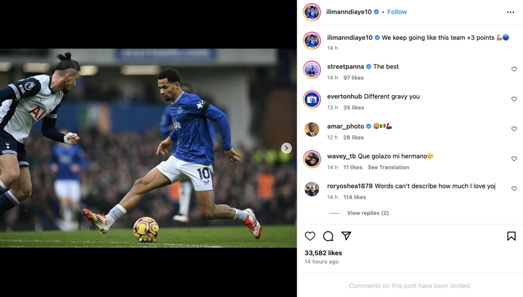 Everton winger Iliman Ndaiye took to social media to celebrate three points after their 3-2 Premier League win over Tottenham on Sunday (January 19).