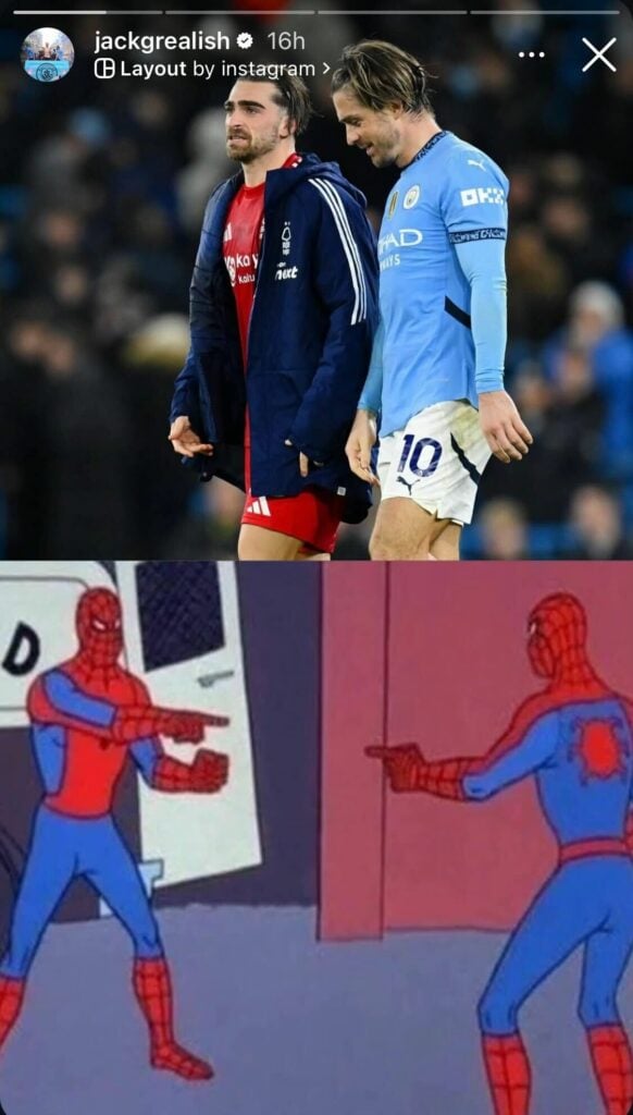 Grealish took to Instagram to share an image of the two talking after the game, accompanied by the famous ‘Spiderman meme.’