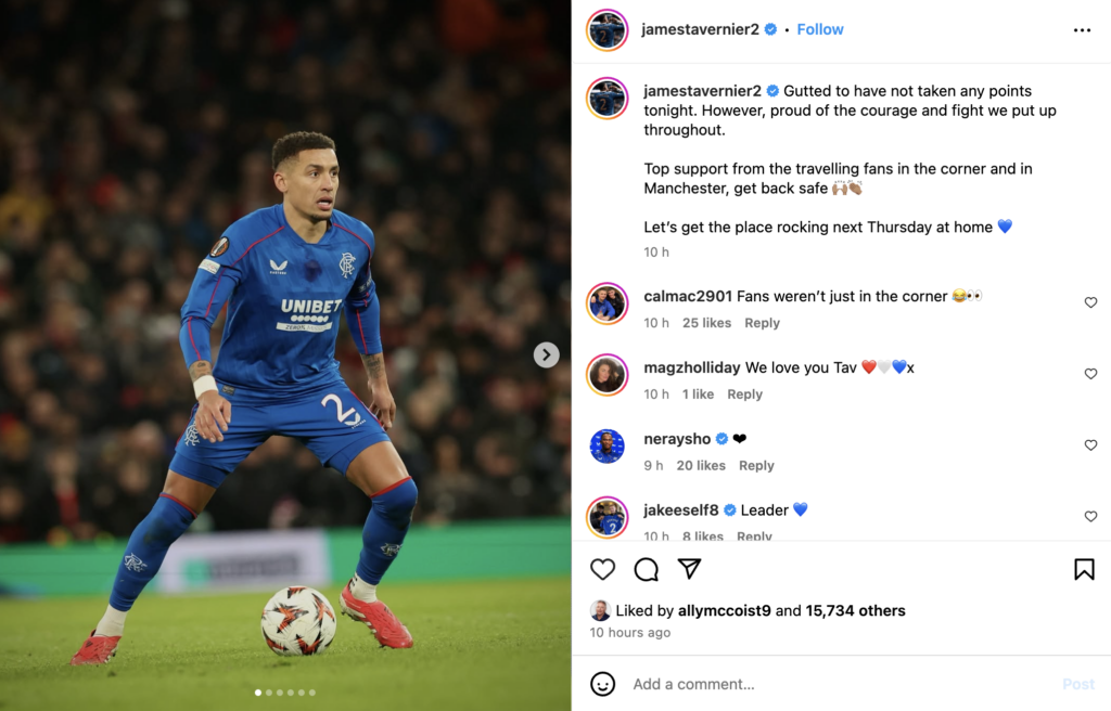Tavernier took to Instagram after the defeat to address the fans, saying: “Gutted to have not taken any points tonight. However, proud of the courage and fight we put up throughout.