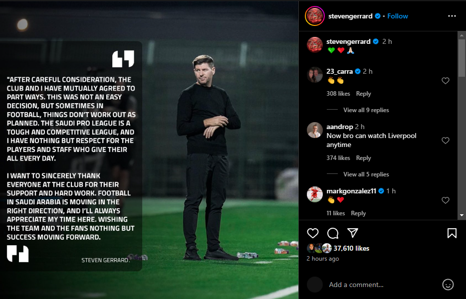 Gerrard’s message on his Instagram post reads: “After careful consideration, the club and I have mutually agreed to part ways. This was not an easy decision, but sometimes in football, things don’t work out as planned. The Saudi Pro League is a tough and competitive league, and I have nothing but respect for the players and staff who give their all every day.