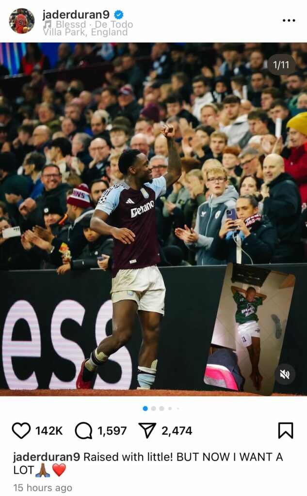 Aston Villa’s explosive forward Jhon Duran has taken to social media to let fans know he still ‘wants more’ after scoring yet again in their 2-0 Champions League win over Bologna on Tuesday (October 22).