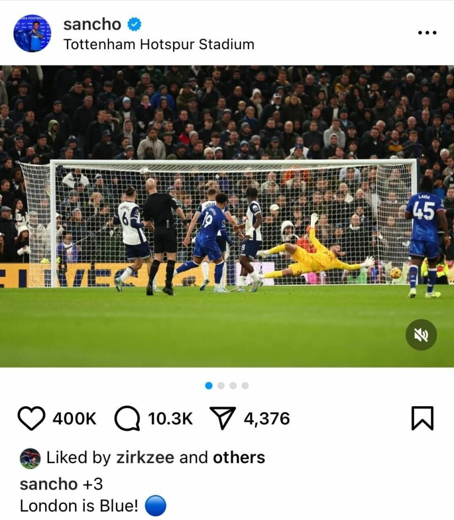 Sancho took to Instagram to celebrate his goal and Chelsea’s impressive come-back win over Tottenham, which Zirkzee promptly liked.