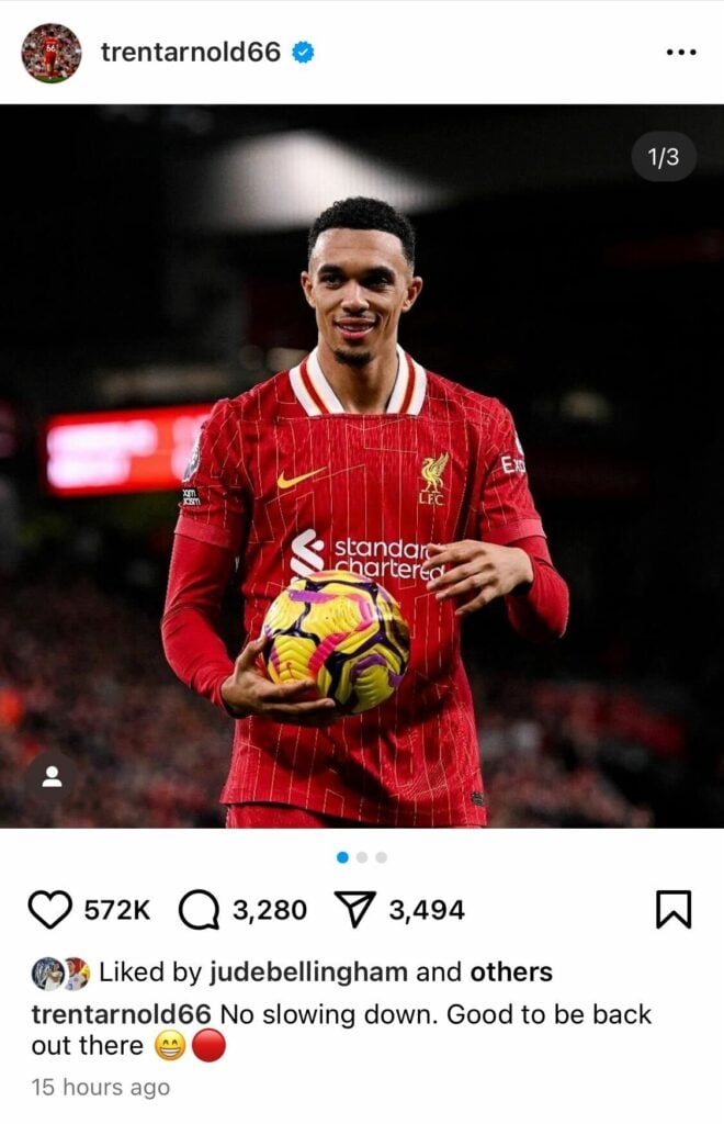 Determined to maintain their strong form, Alexander-Arnold shared a message on Instagram to assure fans there would be no easing off, captioning his post, “No slowing down. Good to be back out there,” which Bellingham promptly liked.