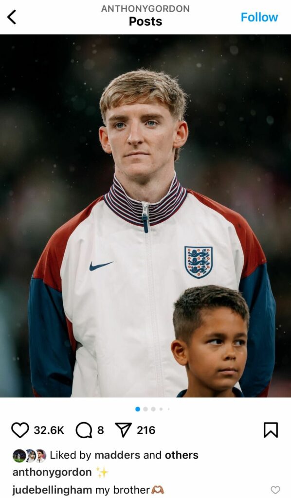 His fine club form has earned Gordon international recognition and he has made an impression on Real Madrid superstar Bellingham who responded to his latest post on Instagram.