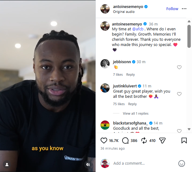 Taking to Instagram (9 January) after the confirmation of his transfer, Semenyo wrote: “My time at Bournemouth. Where do I even begin? Family. Growth. Memories I’ll cherish forever.