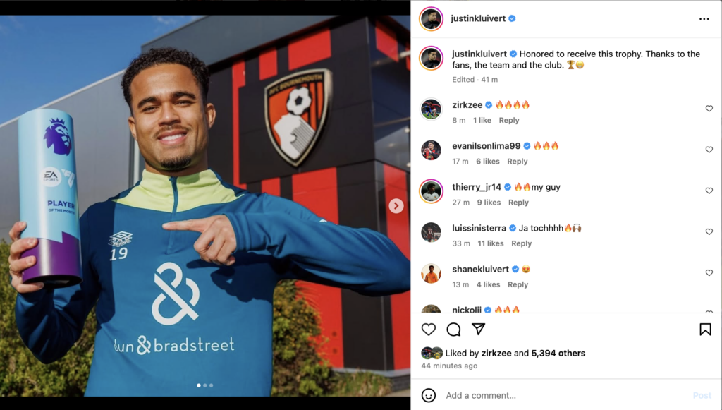 Bournemouth forward Justin Kluivert took to social media to thank the fans after being named the Premier League Player of the Month for January.