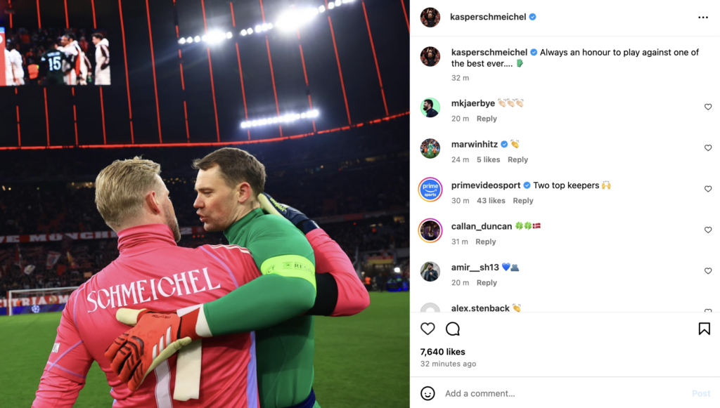 Schmeichel took to Instagram to praise his Bayern Munich counterpart after their aggregate defeat, saying: “Always an honour to play against one of the best ever….”
