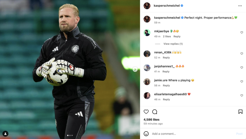 Schmeichel took to Instagram after their comprehensive league win over Dundee FC to celebrate, saying: “Perfect night. Proper performance.”