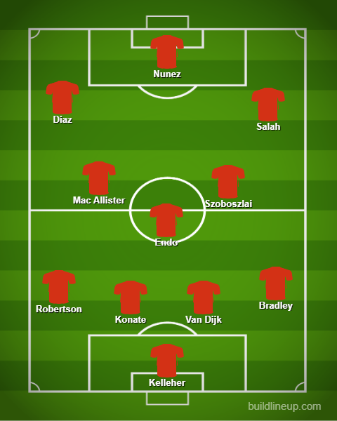 Caoimhin Kelleher, who has performed admirably in Alisson’s absence, will likely keep his spot in the starting XI behind a back four of Andy Robertson, Ibrahima Konate, Virgil van Dijk and Conor Bradley.