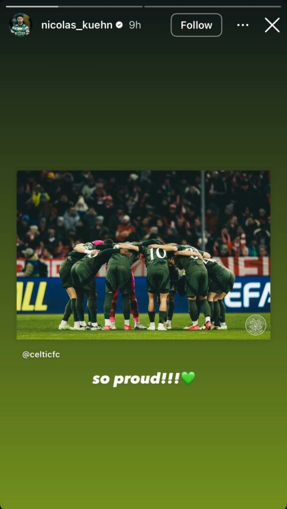 Celtic winger Nicolas Kuhn took to social media to express his pride after Bayern Munich knocked them out of the Champions League on Tuesday in heartbreaking circumstances (February 18).