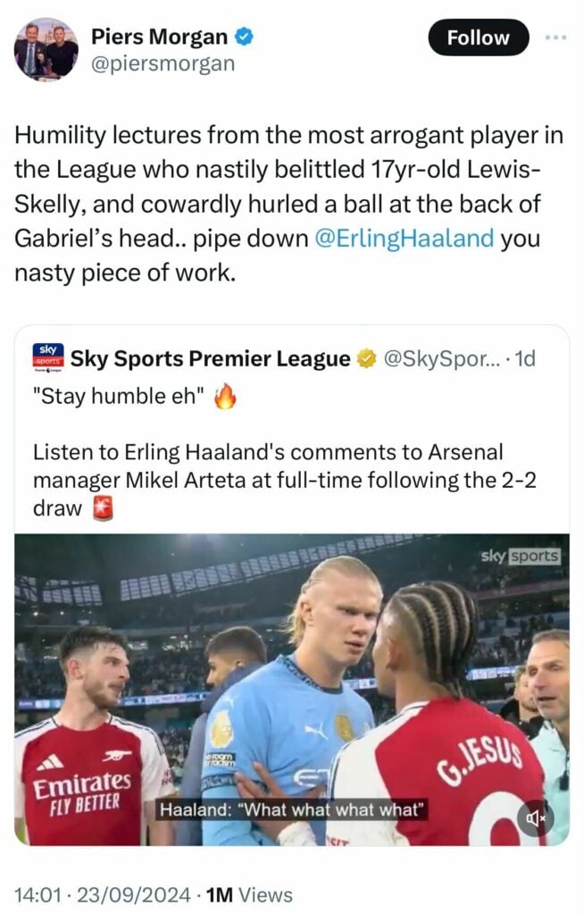 Arsenal fan Piers Morgan unhappy with Erling Haaland antics