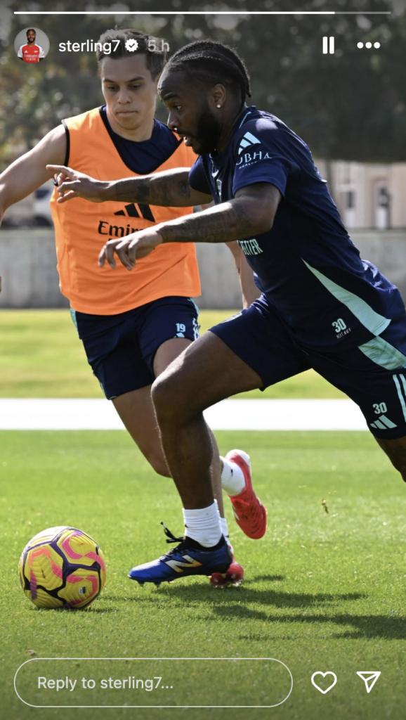 Arsenal winger Raheem Sterling took to social media to share an update as the team prepares to face Leicester City.