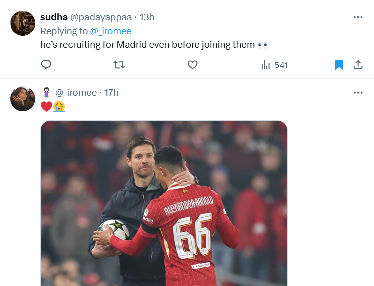 However, the Reds supporters were more interested by Alexander-Arnold’s post-game picture on Instagram with him and Alonso together.