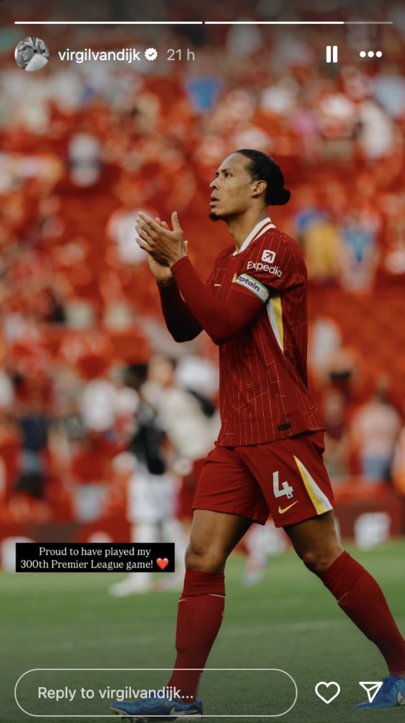 Despite a frustrating draw against Arsenal, where the Reds surrendered a two-goal lead, Van Dijk was in good spirits as he marked a major career milestone. The captain shared on his Instagram story: “Proud to have played my 300th Premier League game!”