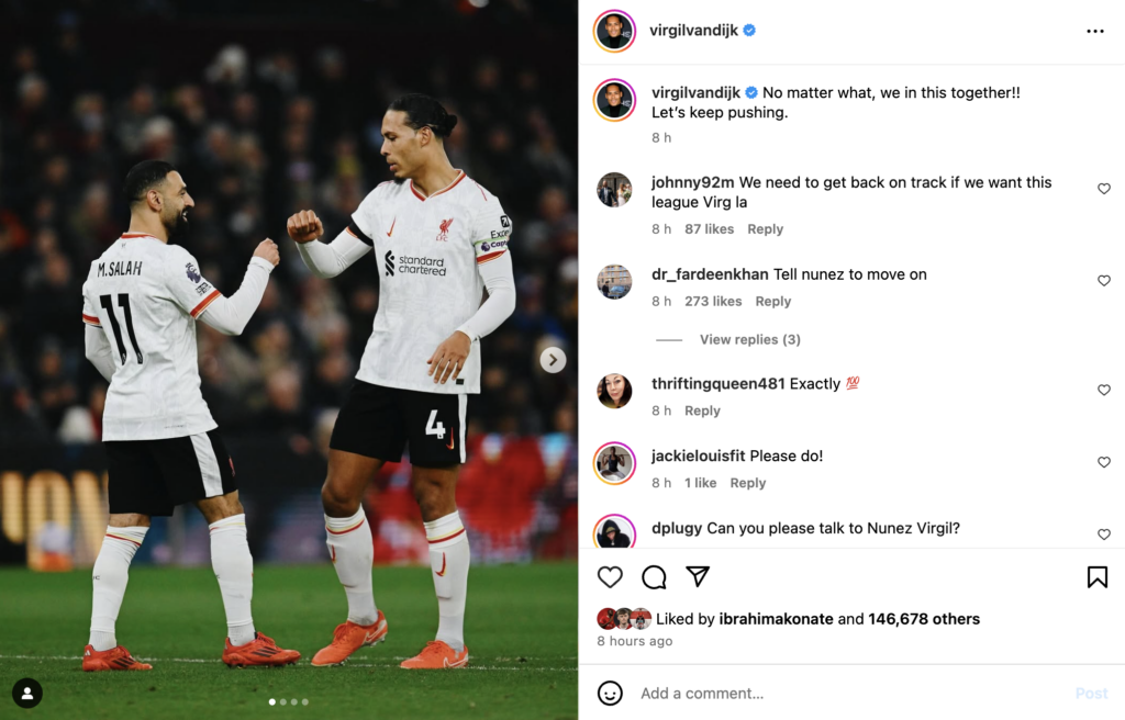Van Dijk took to Instagram after the 2-2 draw with Aston Villa to rally the troops ahead of the title run-in, saying: “No matter what, we in this together!! Let’s keep pushing.”